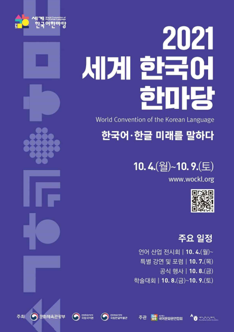 이 밖에도 ‘2021 국립국어원 인공지능 언어 능력 평가’, 세종학당재단의‘한국어 말하기·쓰기 대회’, 국립박물관문화재단이 주관한 ‘한글 창의 산업· 아이디어 공모전’ 등이 ‘2021 세계 한국어 한마당’ 연계 행사로 열린다.