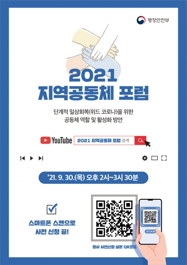 이와 관련해 행정안전부에서는 단계적 일상회복을 위한 공동체 역할 및 활성화 방안에 대해 논의하는 ‘2021년 지역공동체 포럼’을 9월 30일 오후 2시 세종시 조치원 문화정원에서 개최한다고 밝혔다.