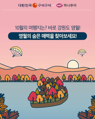 한편 하나투어는 10월 ‘이달의 여행지역’ 선정 연계 가족, 연인들이 소규모로 즐길 수 있는 영월 비대면 안전여행 숙박 패키지 상품을 신규 출시했다.
