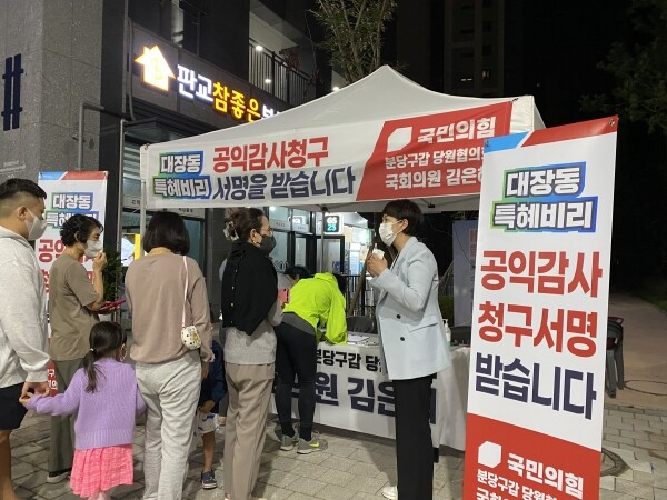 전날 대장동 더샵판교포레스트 12단지 아파트 앞에서 진행된 감사 청구인 모집에는 해당 지역 주민들이 자정 가까운 시각까지 적극 동참하는 등 대장동 개발사업 진실 규명에 대한 국민의 뜨거운 관심을 느낄 수 있었다고 김 의원은 전했다.