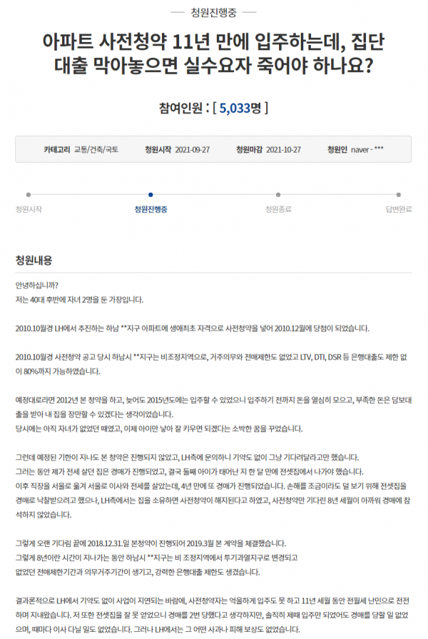 또한, 청와대 국민청원에도 ‘2010년 경기도 하남시 감일지구 한 아파트에서 생애최초 자격으로 사전청약을 신청해 당첨되어 8년의 기다림 끝에 2018년 12월 본 청약을 신청해 아파트를 계약해 올해 10월 입주를 기다리고 있었는데 갑자기 금융위원회가 대출 한도를 축소시켜 아파트 계약이 취소되고 길거리에 나앉게 생겼다’는 청원이 올라와 5,000명이 이상이 동의한 상황이다.