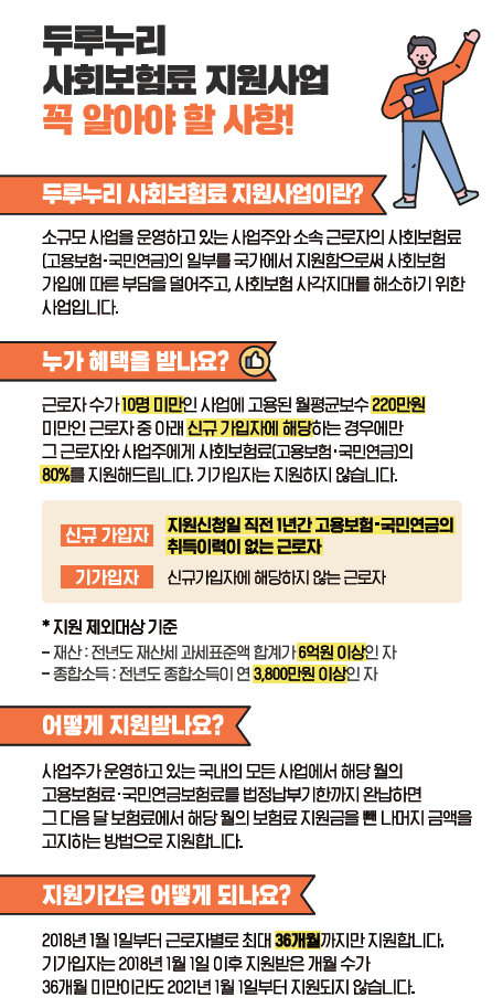 또한 공단은 두루누리 사회보험료 지원사업을 통해 소규모 사업을 운영하는 사업주와 소속 근로자의 고용보험료 일부를 지원함으로써 부담을 덜어주고 있고 지자체와 업무협약을 체결해 정부 지원금을 제외한 사회보험료의 사업주 부담금을 추가로 지원하는 협업 사업을 지속해서 펼치고 있다.