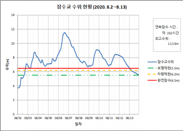 서울시 용산구와 서초구를 연결하는 잠수교가 2020년 8월 3일 오전 6시 40분부터 10일간 연속으로 ’완전 잠수‘ 기준 수위인 6.5m를 초과해 통행이 제한됐다.
