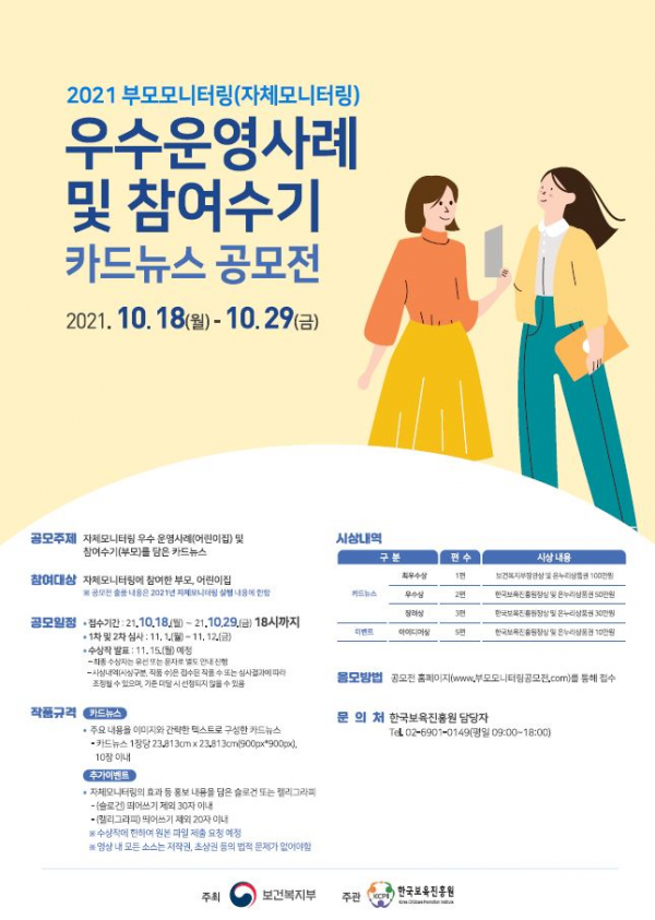 보건복지부 정호원 보육정책관은 “부모의 적극적인 참여를 통한 어린이집 신뢰 구축은 안심 보육환경의 중요한 요소로 공모전을 통해 부모모니터링의 긍정적인 경험을 공유하고 확산시킬 수 있도록 많은 참여를 부탁드린다”고 밝혔다.