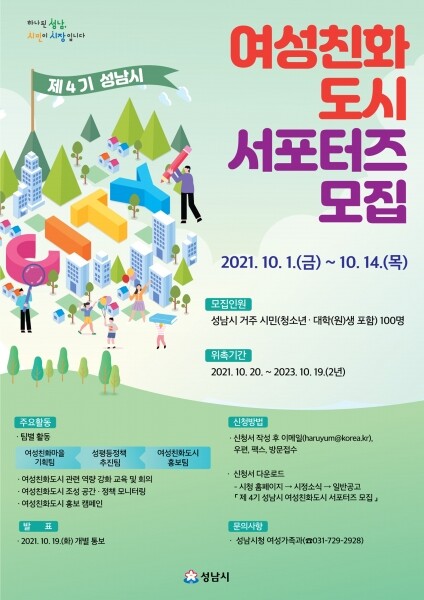 참여 희망자는 신청서를 성남시청 서관 6층 여성가족과에 직접 내거나, 담당자 이메일로 보내면 된다.