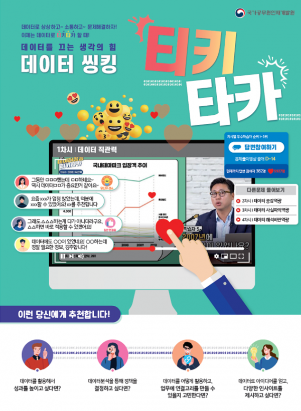 국가공무원인재개발원은 공공·민간 데이터를 활용한 문제풀이 형식의 온라인 학습과정 ‘데이터 사고력 주고받기’를 ‘나라배움터’에서 운영한다고 6일 밝혔다.