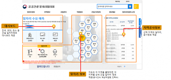 일자리알리미는 근로자의 지역, 직종 등 희망 조건에 맞춰 근로자 거주지 인근 개설현장의 건설사, 공사기간, 예상 작업량 및 작업공종, 현장 구인공고 등 일자리 예측정보를 제공한다.