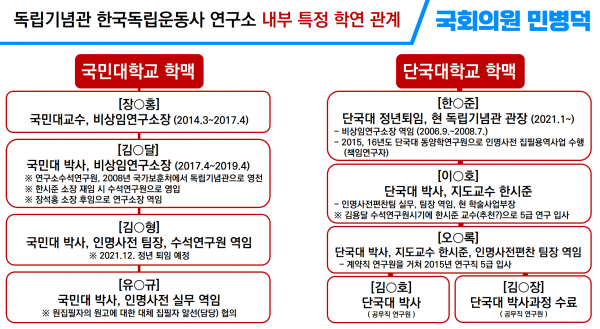 민의원이 입수한 자료에는 2015년 한국독립운동 인명사전편찬사업 시작 당시 독립기념관장은 윤주경, 비상임연구소장 장0홍, 김0달 수석의원과 이0호 연구원이 책임자로 사업을 계획하고 의사결정자로 참여했고 현재 김0형, 이0호, 오0록, 유0규에 의해 인명사전편찬위원회의 실무를 담당, 인명사전 편찬사업이 주도되옴 이라고 적혀있다.