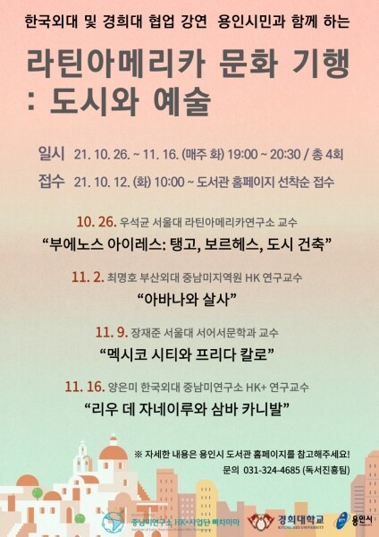 시 도서관사업소 관계자는 “앞서 지난 5~7월에도 한국외대 및 경희대와 함께 진행한 라틴아메리카 문화 기행 강좌의 음식문화편도 많은 시민들이 성원을 보내주셨다”며 “이번 강의를 통해 라틴아메리카에 대해 또 한 번 새롭게 알아볼 수 있는 시간이 되길 바란다”고 말했다.