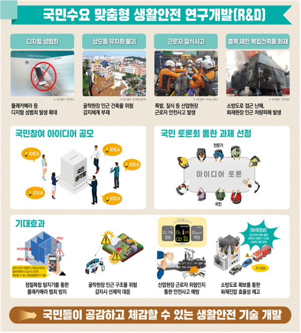 행정안전부는 국민들로부터 생활 속에서 느끼는 재난안전 사고 위험요소나 불안 요인을 해결할 수 있는 아이디어와 주제를 공모해 연구개발을 지원하는 “국민수요 맞춤형 생활안전 연구개발” 사업을 2019년부터 추진해 오고 있다.
