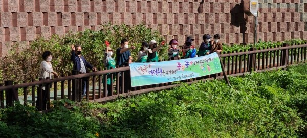 이날 봉사단과 동 직원 등 14명은 미리 준비한 EM흙공 300개를 영덕천 상류 500m 구간에 던져넣고 산책로 일대에서 생활쓰레기를 수거했다.