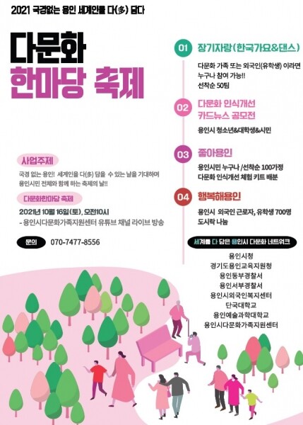 ‘국경없는 용인, 세계인을 다多담다’를 주제로 이날 행사는 백군기 용인시장과 정춘숙 국회의원, 김기준 용인시의회 의장의 축사를 시작으로 다문화가족과 외국인주민이 참여하는 장기자랑 본선 무대 및 시상식, TV조선 미스터트롯에 출연해 인기몰이한 가수 신인선의 축하 무대 등으로 꾸며진다.