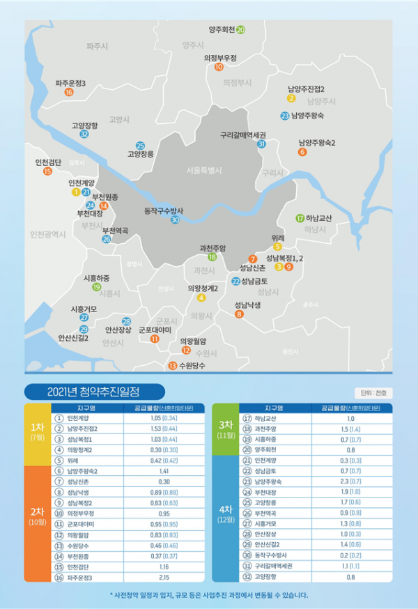 10월에는 3기 신도시인 남양주왕숙2 지구 1.4천호, 성남 신촌·낙생·복정2 등에서 1.8천호 등 총 1만여호가 공급될 예정이다.