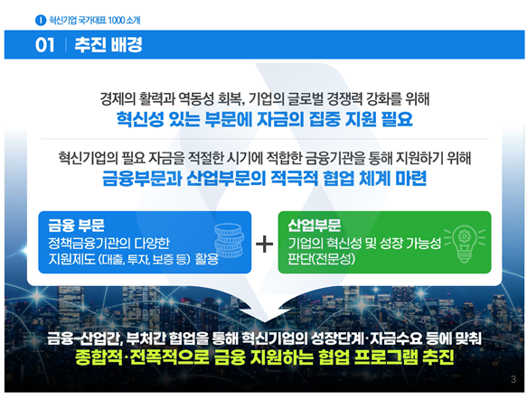 ‘혁신기업 국가대표 1000’ 프로그램은 금융위원회와 산업통상자원부, 중소벤처기업부 등 각 산업부문 관계부처가 협업해 중소·중견기업의 혁신성에 기반한 전폭적인 금융지원을 실시하기 위해 마련됐다.