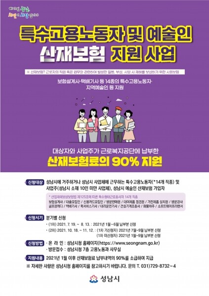신청대상은 성남시에 거주하거나 근무하는 택배기사, 보험설계사 등 14종의 특수고용노동자와 사업주, 지역예술인이다.