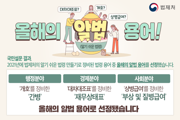 이강섭 처장은 “국민과 함께 알기 쉬운 법령을 만들기 위해 금년도에 처음으로 시작한 ‘올해의 알법 용어’ 선정에 많은 참여와 관심을 주셔서 감사드린다”며 “법제처는 앞으로도 국민 누구나 쉽게 읽고 이해할 수 있는 좋은 법을 만들기 위해 계속해서 노력하겠다”고 전했다.