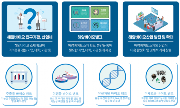 해양바이오뱅크는 추출물, 유전자원, 미생물, 미세조류 등 4개 분야로 구성되어 있으며 이를 통해 현재까지 총 7,626건의 해양생명소재가 등록됐고 643건의 소재를 분양하는 등 해양생명자원의 산업화에 기여하고 있다.