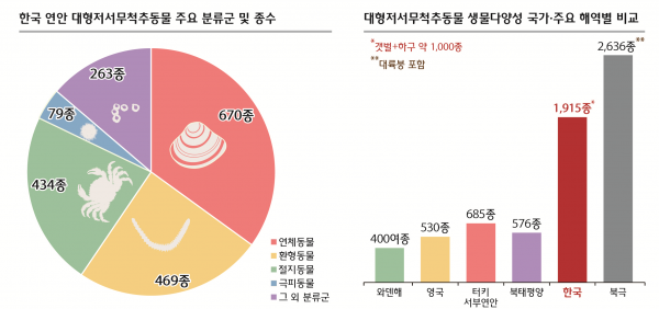 유럽 와덴해 400여 종, 영국 530종, 터키 서부연안 685종, 북태평양 576종, 북극전체 2,636종과 비교해 볼 때, 총 1,915종의 우리나라 해양저서무척추동물의 종수는 해양생물다양성 측면에서 세계적으로 독보적임이 국제 학계에 최초로 알려진 셈이다.