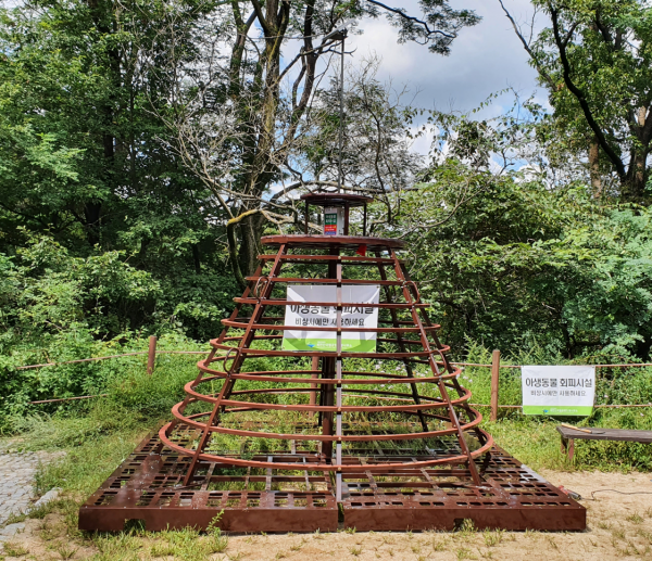 야생동물 회피시설은 멧돼지 등 야생동물이 탐방객에게 접근하면 탐방객이 약 2m 높이의 원뿔 형태 시설물을 사다리처럼 밟고 올라가 피할 수 있도록 제작됐으며 이 시설 주변에서 야생동물이 나타나면 4명의 탐방객이 대피할 수 있도록 설계됐다.