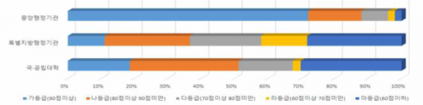 우수 수준 ’가’등급을 살펴보면 중앙행정기관에는 문화재청 등 36개 기관이, 특별지방행정기관은 서해지방해양경찰청 등 16개 기관이, 국공립대학교는 경상대학교 등 8개 기관이 선정됐다.