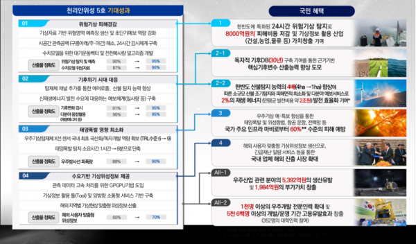 그리고 천리안위성 5호 개발을 통해 7,300억원 수준의 우주산업 분야 생산유발 및 부가가치 창출, 1천명 이상의 우주개발 전문인력 확대와 5천 6백명 이상의 고용 유발효과를 창출하고 운영을 통해 8,000억원 이상의 위험기상 피해액 저감 효과를 얻을 수 있어 국가 경제와 일자리 창출에도 크게 기여할 것으로 기대하고 있다.