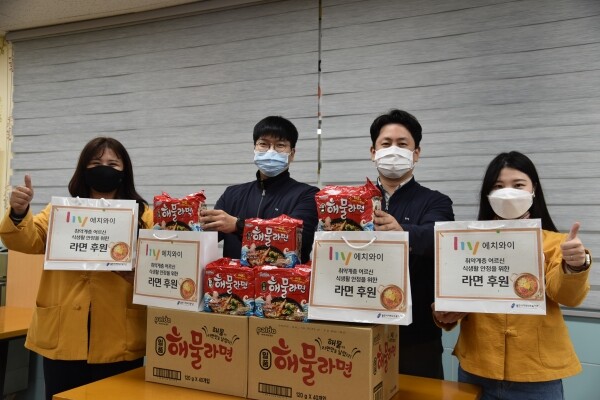 ㈜에치와이는 홀몸 어르신들과 복지사각지대의 취약계층 어르신들의 식생활 안정을 위해 자사제품 라면 총 110개를 후원했으며 직원들은 직접 복지관으로 방문해 어르신들에게 라면 전달을 위해 직접 포장작업을 진행하는 등의 봉사활동까지 진행했다.
