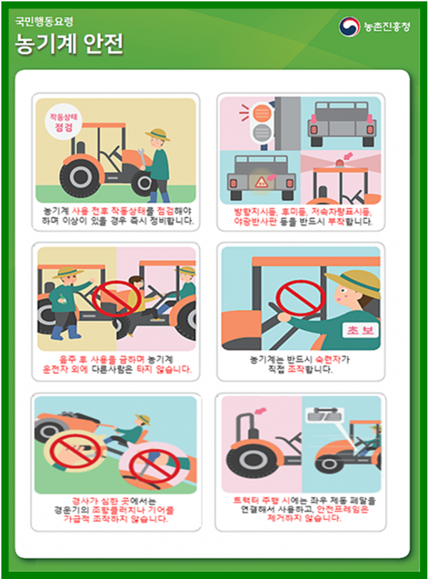 고광완 행정안전부 예방안전정책관은 “농기계 운행 시에는 도로가 정비되지 않은 경우가 많음을 감안해 특히 주의를 기울여야 한다”며 “농기계의 경우 일반 차량에 비해 조작이 어려운 만큼 운행법을 잘 숙지한 후 교통법규를 철저히 지켜 운행하며 피곤하면 중간중간 충분히 쉬어가면서 작업하는 것이 중요하다”고 강조했다.