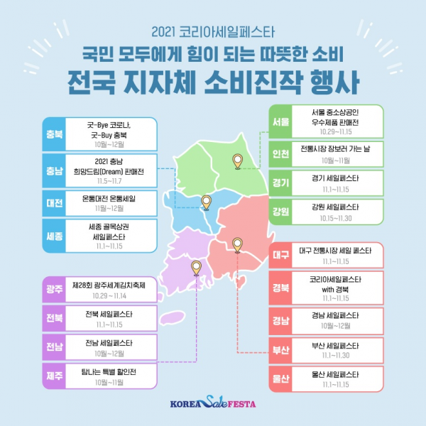17개 시·도는 부산 국제수산 엑스포, 대전 온통세일 축제, 광주 세계김치축제, 대구 전통시장 세일 페스타, 제주 탐나는 특별할인전 등 지역의 특색을 담은 소비진작 행사를 개최하고 정부도 농축수산물과 중소기업·소상공인 제품을 보다 할인된 가격으로 판매할 수 있도록 할인쿠폰 발행, 다양한 온·오프라인 기획판매전 개최 등을 지원한다.