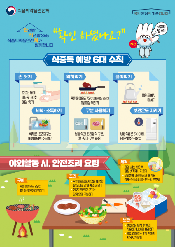 식약처는 가을철에 음식물 취급과 보관에 조금 더 주의를 기울인다면 건강하고 안전한 나들이가 될 수 있으므로 국민들께서는 식중독예방 6대 수칙을 꼭 실천해 주시기를 당부드린다고 전했다.