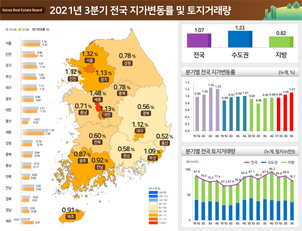 건축물 부속토지를 제외한 순수토지 거래량은 약 27.3만 필지로 2분기 대비 19.4% 감소, ’20년 3분기 대비 1.2% 증가했다.