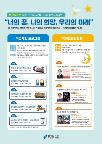관심 있는 시민은 남사도서관 홈페이지에 신청하면 되고 이날부터 각 강연당 100명을 선착순으로 모집한다.