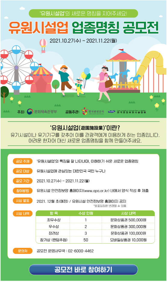 이번 공모에는 국민 누구나 참여할 수 있으며 공모에 참여하려면 유원시설업의 새로운 명칭과 그 의미를 작성해 유원시설 안전정보망 누리집에 접수하면 된다.