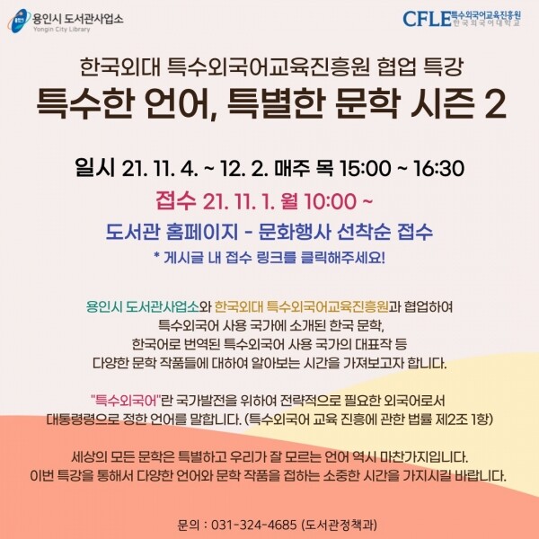 시 도서관사업소 관계자는 “앞서 지난 8월 진행했던‘특수한 언어, 특별한 문학’에 많은 성원을 보내주셔 이번에 시즌2를 기획하게 됐다”며 “세상의 모든 문학은 특별하다 다양한 외국어에 대해 깊이 있게 알아볼 수 있는 좋은 기회가 되길 바란다”고 말했다.