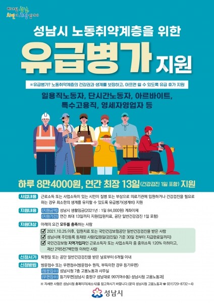 올해 기준 성남시 생활임금을 적용한 금액이며 연간 최장 13일간 유급병가를 지원한다.