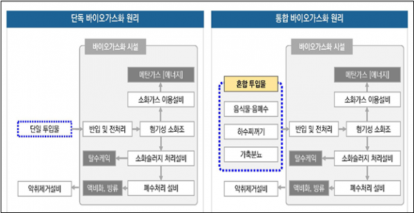 상호보완 특성이 있는 둘 이상의 유기성폐자원이 병합 처리되는 공정 적용을 통해 바이오가스 생산성이 높아지고 규모의 경제 효과로 시설 설치·운영비가 절감되는 장점이 있다.