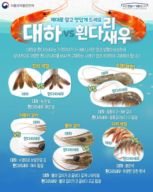 대하와 흰다리새우는 맛은 비슷하지만 상대적으로 저렴한 흰다리새우를 비싸게 구매하는 사례가 있어 주의가 필요한다.