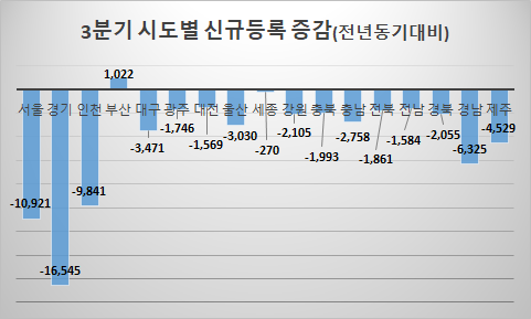 지역별로는 울산, 경남, 인천 순으로 감소폭이 컸고 국산차의 신규등록 대수가 수입차보다 더 크게 감소했다.