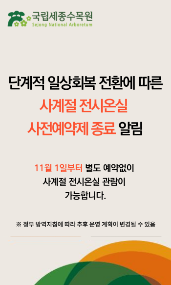 한국수목원정원관리원 소속 국립세종수목원은 정부의 단계적 일상회복 이행 계획 발표에 발맞춰 사전 예약제로 운영되던 사계절전시온실 관람을 오는 1일부터 해제한다.