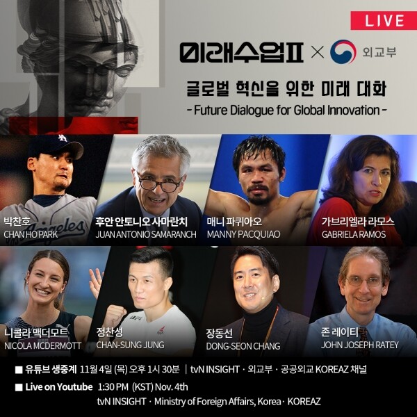 외교부는 tvN 방송사와 협력해 ‘tvN 미래수업’ 특별편으로 이번 행사를 개최하며 행사 실황은 실시간 유튜브 실시간 재생으로 11.4. 13:30부터 국내외 송출될 예정이다.