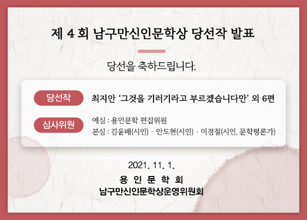 당선자에게는 상금 500만원이 수여되며 시상식은 오는 27일 용인문화예술원 마루홀에서 열리는 ‘2021 남구만문학제’에서 진행된다.