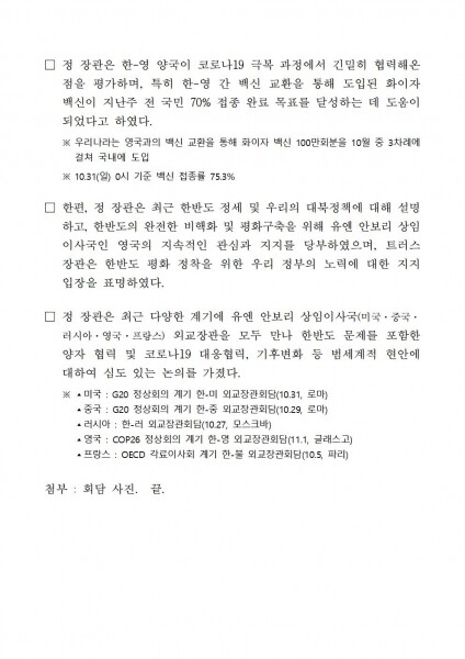 정 장관은 한-영 양국이 코로나19 극복 과정에서 긴밀히 협력해온 점을 평가하며 특히 한-영 간 백신 교환을 통해 도입된 화이자 백신이 지난주 전 국민 70% 접종 완료 목표를 달성하는 데 도움이 됐다고 했다.