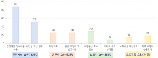 또한, 안전표지 미설치 등 시설 미비, 과속·불법 주정차 등 운전자 법규 위반 및 교차로 구조 부적합 등의 위험요인 총 264건이 확인되어 관련 시설개선 등 대책마련이 필요한 것으로 나타났다.