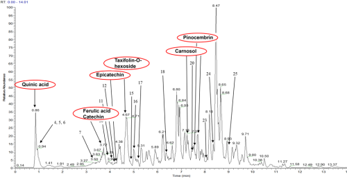 또한, 동일 시료에 대한 항염 효능과 이차대사산물과의 상관관계 분석을 통해 소나무와 측백나무에서 퀸산, 카테킨, 바이플라보노이드 계열의 물질인 로버스타플라본, 사이아도피티신 등을 찾아내고 이 물질이 항염 효능에 주로 기여하는 물질임을 밝혔다.