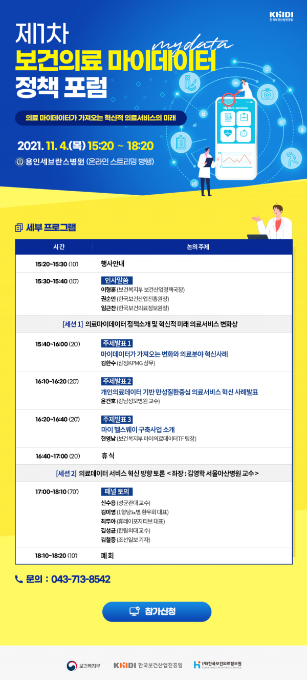 이형훈 보건복지부 보건산업정책국장은 “이번 포럼을 통해 의료서비스 혁신, 국민 건강증진을 위한 마이데이터 생태계 조성의 초석이 다져지길 기대한다”고 밝혔다.