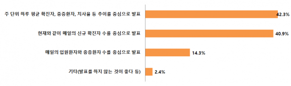 ‘향후 코로나19 예방을 위한 효과적인 정보 전달방식으로는 무엇이 좋을 것인가’라는 질문에 대해서는 ‘주 단위 평균 확진자 등 추이를 중심으로 발표하자’는 의견과 ‘현재와 같이 매일의 신규 확진자 수를 중심으로 발표하자’는 의견이 비슷하게 나타났다.