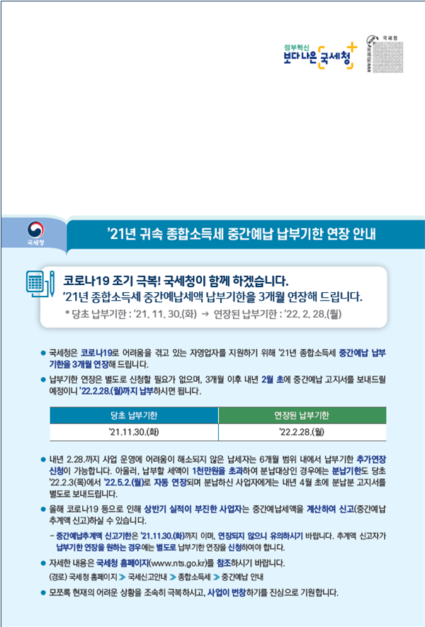 국세청은 코로나19 등으로 어려움을 겪는 납세자를 적극 지원하기 위해 소규모 자영업자 등 136만명의 납부기한을 내년 2.28.까지 직권연장하고 납부기한 연장 안내문을 발송했다.