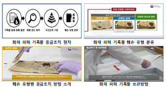 특히 기록물의 일부 연소되고 건조 상태, 일부 연소되고 젖은 상태, 완전 연소된 상태로 피해 유형을 분류하고 그에 맞는 응급조치 방법에 따라 복구한다.