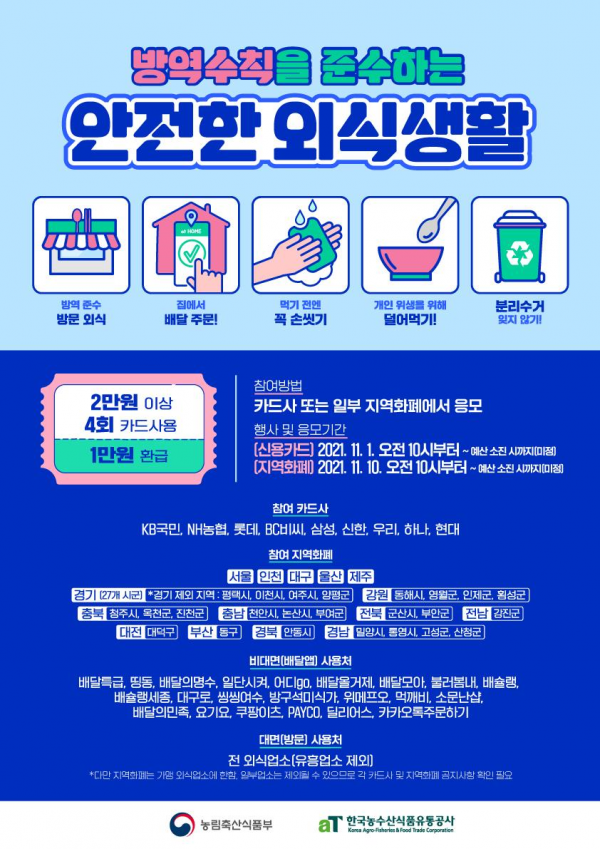 지역화폐를 통한 외식 할인지원 사업은 11월 10일 오전 10시부터 시작할 예정이며 각 지역화폐에 배정된 예산 소진 시 최종 종료될 전망이다.