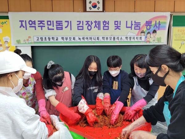 김장 담그기 활동은 고림초등학교 5, 6학년 학생자치회 임원 36명과 학부모회, 녹색어머니회, 학부모 폴리스 임원, 교직원들이 참석한 가운데 오후 2시부터 약 2시간에 걸쳐 진행됐다.