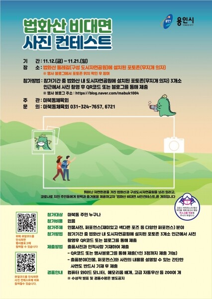 마북동민이면 누구나 참여할 수 있고 법화산 둘레길과 도시자연공원에 조성된 포토존에서 사진 촬영 후 네이버 블로그에 제출하면 된다.